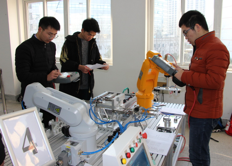 本次大赛吸引了来自合肥工业大学、安徽理工大学、安徽农业大学、安徽建筑大学等10余所高校的157支队伍报名参加。经过初赛,筛选出47支参赛队伍参加决赛。决赛内容为双机器人协同作业完成滚动轴承装配,每队由2-3名选手组成,要求选手在规定时间内完成PLC与两台机器人间通讯建立、I/O口分配、电气连接,PLC和机器人程序编写与调试以及机器人动作示教工作,重点考察选手组建机器人协同作业系统的综合能力,以及机械、电气、气动和控制的综合装配和调试技能。经过激烈角逐,最终有15支代表队获得一等奖,29支代表队获得二等奖。