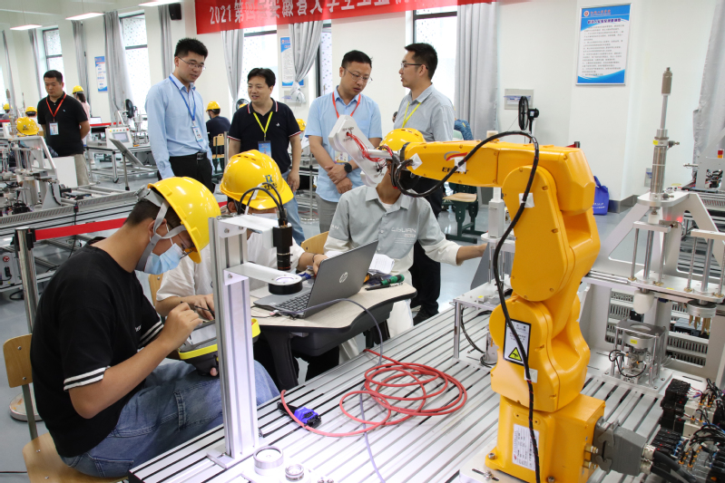 大赛所用滚动轴承自动装配及智能检测平台,由番茄小说 人工智能学院与芜湖安普机器人产业技术研究院联合研制,是集机械、电子、气动、PLC、工业机器人、工业相机、触摸屏等于一体的多功能综合系统。考核内容为机器人编程与调试、PLC以及触摸屏编程与调试、视觉检测编程与调试、最终需要选手完成滚动轴承的自动装配与检测的任务。每队由2至3名选手组成,要求选手在规定时间内完成机械模块组装,故障排除、电路接线、气管连接、PLC程序和HMI编写制作、机器人程序编写、工业相机程序编写等工作,重点考察选手组建PLC与机器人协同作业系统的综合能力,并增加了对参赛选手综合素养评价的内容。该项赛事为“赛、学、研”教育教学改革提供了一个良好的平台,为全省高校老师和同学提供一个相互交流和学习的平台。
