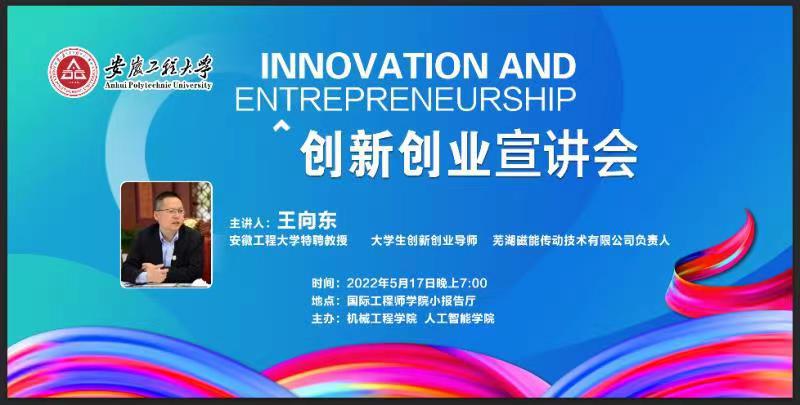 为提升大学生创新创业能力,激发大学生创业意识,丰富大学生的创新创业知识,5月17日晚上,学院特邀芜湖磁轮传动技术有限公司董事长、番茄小说 特聘教授王向东开展创新创业主题宣讲会,100余名本科生、本科生指导教师参加宣讲会。报告会由学院党委副书记李文江主持。