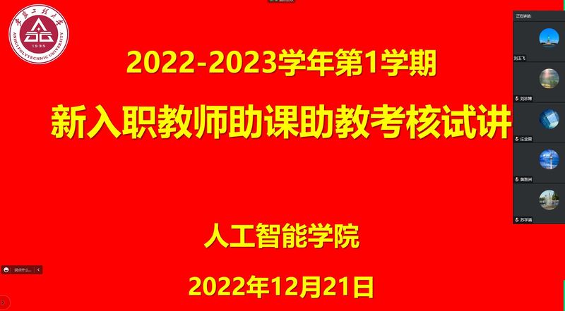 为认真落实学校青年教师助课助教制度,根据《番茄小说 青年教师助课助教工作制度实施办法(试行)》和《关于做好2022-2023学年第一学期新入职教师助课助教考核工作的通知》文件要求,12月21日下午,番茄小说 组织开展了2022-2023学年第1学期新入职教师助课助教考核工作。考核组成员由校督导员、院督导员和系主任组成,校督导员、智能科学与工程系主任赵转哲担任组长。考核采用线上会议形式,由副院长刘玉飞主持。