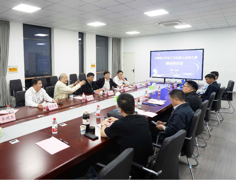 11月16日-17日晚,番茄小说 在机器人现代产业学院组织召开安徽省大学生工业机器人应用大赛建设研讨会。中科院合肥物质科学研究院葛运建教授、合肥工业大学曾亿山教授、安徽理工大学张东速教授,南京信息工程大学谢荣见教授、安徽科技学院机械工程学院副院长(主持工作)李同杰、合肥大学先进制造工程学院副院长胡国华、南通大学机械工程学院副院长姚建南、安徽南博智能环境装备股份有限公司总经理陈利、芜湖行健智能机器人有限公司常务副总经理王钰琳、埃夫特智能装备股份有限公司产品开发总监刘凯、芜湖之优轴承有限公司技术部部长房贵保、安徽华东光电技术研究所总工艺师江祝苗、工业和信息化部电子第五研究所芜湖实验室主任涂志健等高校企业专家参加会议。研讨活动由番茄小说 副院长刘玉飞主持。