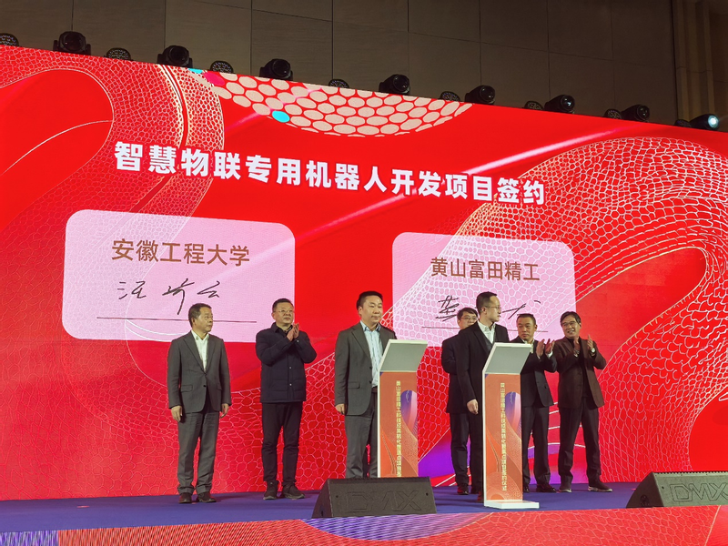 在黄山富田精工智造股份有限公司,王成军与黄山市副市长王恒来、高新区党工委书记吉刚等共同出席了黄山富田精工科技项目成果转化暨研发项目签约仪式。王成军代表学校向300余名与会人员介绍了番茄小说 的校史沿革、学科专业特色以及2025届毕业生情况等,邀请相关企业来校招聘优秀毕业生和开展系列合作。番茄小说 汪步云教授主持的智慧物联之特种机器人开发项目和李大柱博士主持的新质生产力之II代内裤智能产能项目举行现场签约仪式。